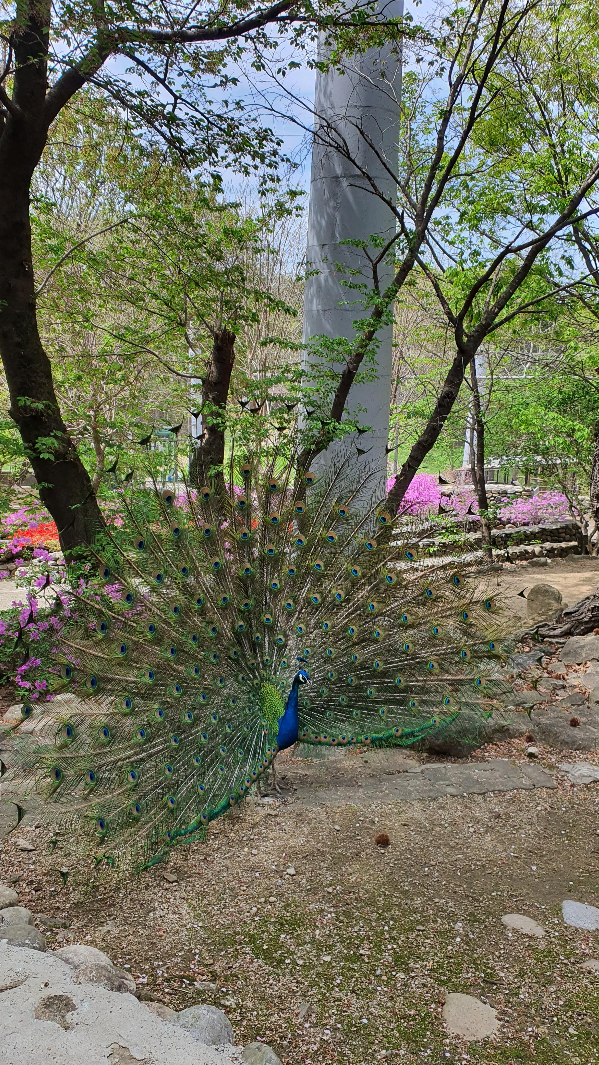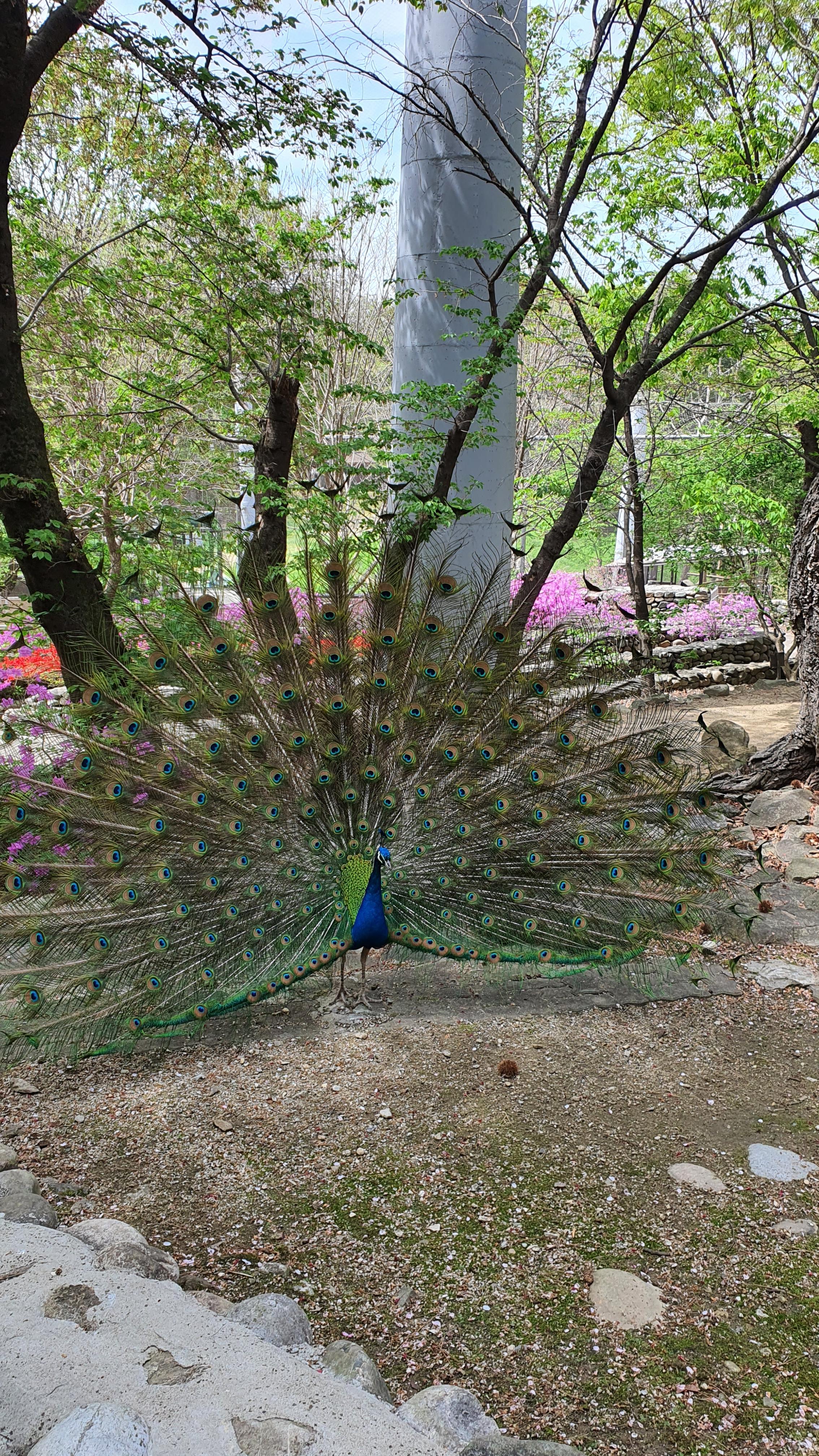 동물원 여러 곳을 둘러보다 공작새가 날개깃을 세우는 화려한 장면을 보았다. 주택에서 공작새를 키워 본 길형환 동문이 공작새가 저렇게 화려하게 깃을 세우지만 집에서는 키울 수가 없다고 한다. 멋진 모습과 달리 밤에 돼지 목따는 소리로 울부짓는다고 했다.